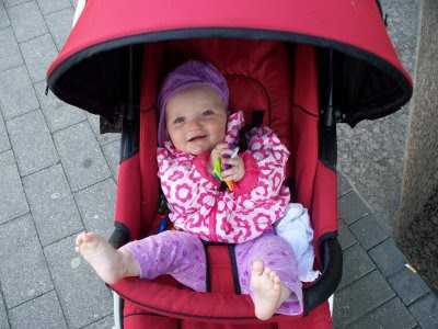 Being two months premature, Annika is a bit behind on her motor skills, so her doctor recommended some physical therapy sessions. (Dubbed "baby gymnastik" in German, which sounds more fun and less medical.) It has become clear that my mellow little baby is just as strong-willed as her big sister. Annika likes sitting up. Annika LOVES sitting up. Annika will cry if you lay her down on her back to play (she is tolerating it a little better now, though). So we had been letting her sit up to the exclusion of any other position, which is not so good for learning those little skills like rolling over and crawling. Just making her lay down and putting a few toys just out of reach has made her much more mobile.
